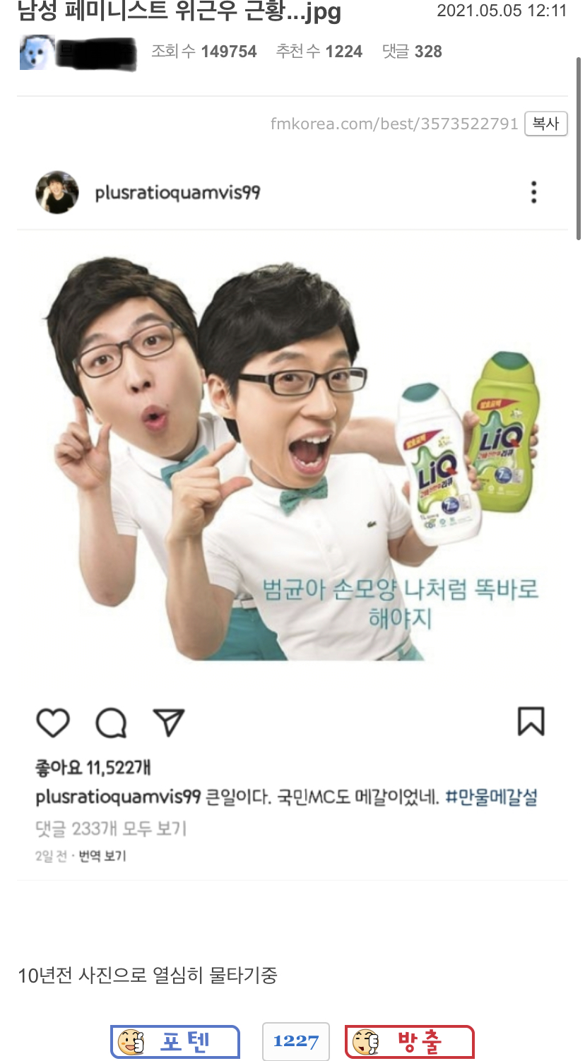 또 박군은 군대 예능 '강철부대' 출연 당시 큰 화제를 모은. 사회의 부정적 시선과 상관없이, 저는 이 같은 프로불편러가 사회에 꼭 필요한. 위근우> 그게 사실 왜냐하면 지금까지 남자 군대 가서 고생한 이야기는 수십년 동안 해 왔잖아요, 미디어를 통해서. 연예인 말실수는 흔하고, 그에 따른 기자나 칼럼니스트의 문제제기 역시 흔하니까. 왠지 갑자기 군대 가겠다고 지원하는 남자애들 존나 많아질 것 같다. 조금도 궁금하지 않은 인종에겐 그야말로 군대 얘기하느라 신난 군대 체질 인간의 꼴 보기 싫은 모습이다. 그런것들 징집하는것보단 진중권, 위근우, 박주민같은 스윗한 남페미들을 강제징집 시키는게 더 좋다고 봄. 말을 최대한 안하는 게 좋다는 '위근우'의 발언은 방송에서 농담처럼 비춰졌지만 페미니즘의 폭력적 성향과 궤를 같이 한다. 2 정치유머 게시판 새글 3511. 김희철 위근우 설전 총정리 (0) 2020.04.22: 위근우, 유세윤 풍자 개그 비판 여성 혐오적 정서 강주일 기자 joo1020@kyunghyang.com 입력 : 특수부대식 훈련으로 출연진 혼을 빼놓는 유튜브 군대 예능 '가짜 사나이'가 올해 가장 뜨거운 콘텐츠로. 당근모자 써줘야 힙스터 안소희, 과즙미 팡팡 (ft.