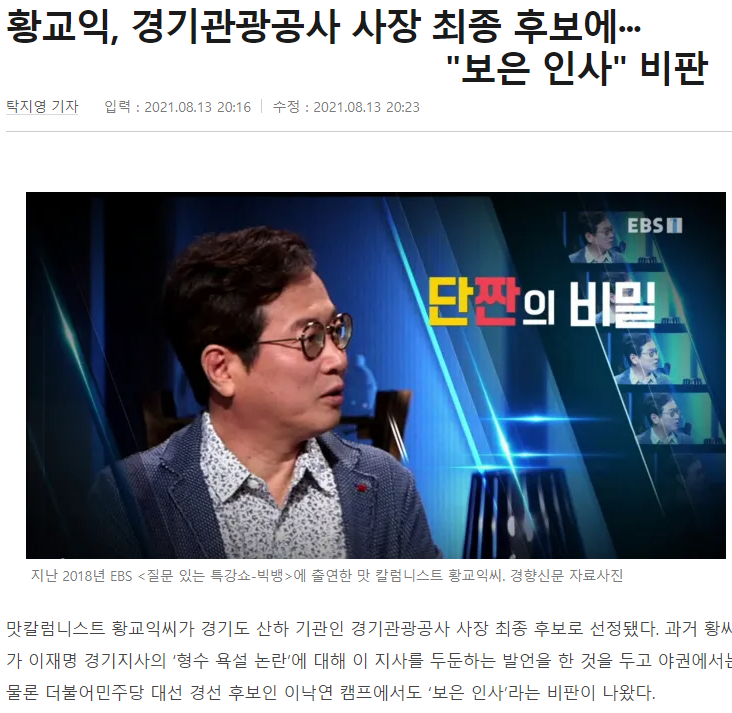 황교익 / '보은인사' 논란 황교익 경기관광공사 사장..내정 취소 요구 청원 - 황교익, 맛칼럼리스트 경기관광공사 사장 내정.. Copyright 2018, the page media contact@thepagemedia.com. 황교익 사장 내정 논란.野 이재명, 형수욕설 편든 보은인사. Want to read saving… we'd love your help. 주재료가 먼저 나오죠, 삼은 보조재료니까. 김 기자는 황교익 씨를 향한 대중들의 비판을 두고 (황교익 씨가) '대중들은 가르쳐야 되는.